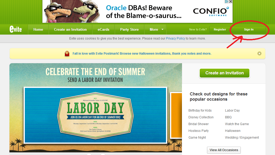 First, please visit http://www.evite.com/ and click on "Sign In" to your upper-right corner.